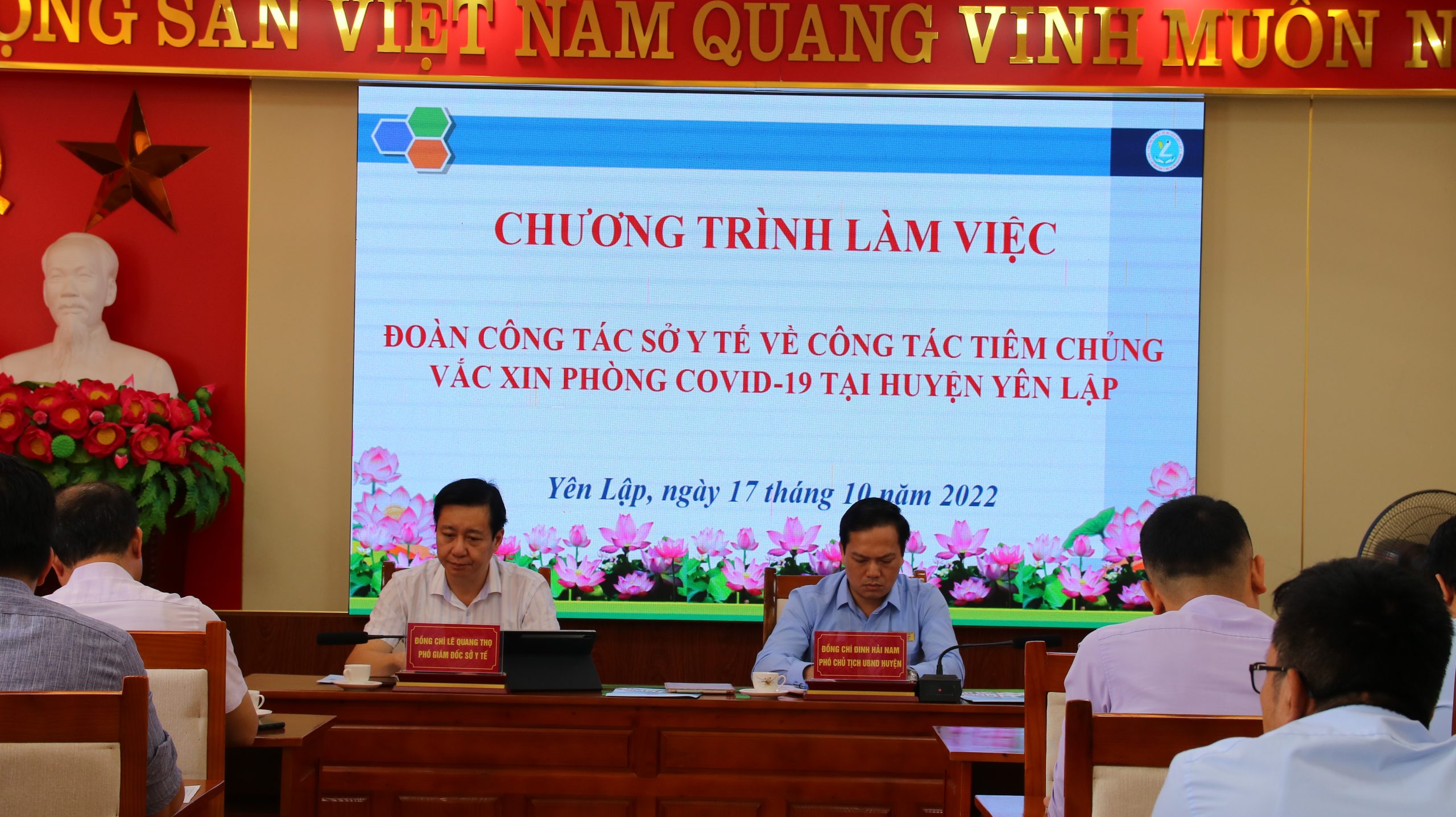 Ngày 17/10 vừa qua, Đồng chí Lê Quang Thọ Phó Giám đốc Sở Y tế tỉnh Phú Thọ làm trưởng đoàn đã về kiểm tra công tác tiêm chủng vaccine phòng Covid-19 tại huyện Yên Lập. Làm việc với đoàn phía huyện có Đồng chí Đinh Hải Nam Ủy viên Ban Thường Vụ Huyện Ủy Phó chủ tịch Ủy Ban Nhân Dân huyện – Trưởng ban chỉ đạo phòng chống Covid – 19 huyện; đồng chí Lê Minh Sáng – Trưởng Phòng Y tế huyện; đồng chí Lê Công Bình – Giám đốc TTYT huyện Yên Lập; đồng chí Hoàng Văn Thắng – Phó giám đốc TTYT huyện Yên lập và Trưởng Trạm Y tế 17 xã thị trấn.