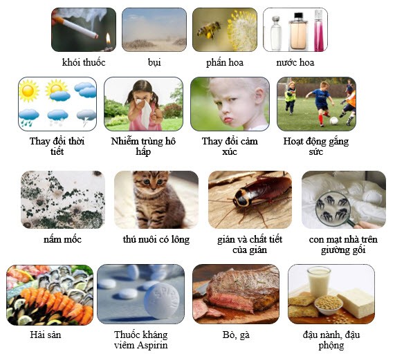 Một số thức ăn có thể gây cơn hen: Hải sản, bò, gà, trứng, sữa, có chứa chất bảo quản Sulfit (cà chua đã chế biến, tôm, quả khô, bia và rượu vang) hoặc lên men như bia, rượu, mắm, tương chao…2