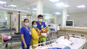 Sau 72h liên tục tự thở được hoàn toàn, ngày 07/4/2021 người bệnh đã được ra viện trở về bên gia đình, Thay mặt khoa Cấp cứu, HSTC&CĐ, BS CKI Đinh Xuân Hạnh trưởng khoa cùng các bác sỹ, điều dưỡng đã dành tặng một phần quà và đóa hoa tươi thắm như một lời động viên, chức mừng gia đình đã kiên cường vượt qua một quãng thời gian dài với muôn vàn khó khăn.