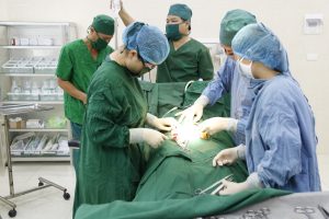Kíp phẫu thuật gồm 3 sỹ chuyên ngành sản và hồi sức cấp cứu cùng 3 điều dưỡng khẩn trương chuẩn bị sẵn sàng các trang thiết bị, thuốc, hồng cầu, dịch truyền, vật tư cần thiết cho ca phẫu thuật. Bắt đầu quá trình phẫu thuật, các bác sỹ mở bụng, trong ổ bụng nhiều máu màu nâu sẫm, tiến hành hút dịch ổ bụng. Sau khi hút sạch, bác sỹ dùng tay cẩn trọng tìm đáy tử cung, tìm vòi trứng tổn thương thấy vỡ khối chửa đoạn loa vòi tử cung phải, đoạn vòi trứng tổn thương được kẹp lại cầm máu. Do vòi tử cung bị vỡ, chảy máu nhiều nên để cứu người bệnh, bác sỹ thực hiện cắt bỏ túi chửa và vòi tử cung phải. Trong quá trình phẫu thuật, hút hết dịch máu trong ổ bụng được 2.200ml (2,2 lít). Người bệnh được truyền dịch và 2 đơn vị hồng cầu nhóm máu B. Ca phẫu thuật thành công, chị C thoát khỏi tình trạng nguy hiểm sau 30 phút căng thẳng và nỗ lực của cả kíp phẫu thuật và chính bản thân chị C.