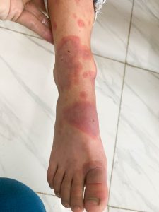 Gia đình cho biết cháu bị mắc COVID-19 đã âm tính gần 3 tháng. 3 ngày trước, cháu xuất hiện sốt nóng sốt cao từng cơn uống thuốc hạ sốt gần như không đỡ, buồn nôn và nôn, kèm theo ban sẩn ngứa toàn thân. Đã đến phòng khám tư nhân khám và được kê đơn về nhà uống thuốc nhưng không đỡ.