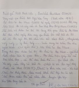Những ngày đầu xuân Quý Mão, qua Hòm thư góp ý, Trung tâm Y tế huyện Lập nhận được một bức thư cảm ơn từ con gái cụ ông N.V.S 92 tuổi mà chúng tôi đang kể trên với những lời mộc mạc, gần gũi nhưng vô cùng xúc động. Qua bức thư, con gái cụ thay mặt gia đình gửi lời cảm ơn đến Trung tâm Y tế huyện Yên Lập nói chung và các Bác sĩ Khoa CC,HSTC&CĐ nói riêng. Chúng tôi xin phép được đăng nguyên văn bức thư của gia đình cụ lên đây để cảm ơn sự tin tưởng, những lời động viên của cụ cũng như gia đình đã dành cho chúng tôi, những người làm công tác chăm sóc sức khỏe cho nhân dân. Chúng tôi cũng xin được gửi tới cụ cùng gia đình lời chúc sức khỏe, hạnh phúc, an khang, thịnh vượng.
