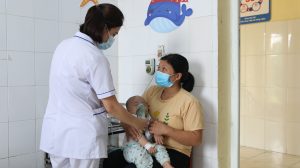Tuy chỉ mới 1 tháng tuổi, nhưng bé N.G.H (ở xã Đồng Thịnh, huyện Yên Lập) cũng gặp tình trạng ho khò khè, có đờm, sốt, bú kém, đến ngày thứ 3 được gia đình đưa đến Trung tâm Y tế để thăm khám. Qua thăm khám, bệnh nhi tỉnh, bú kém, sốt nóng 38 độ C, không nôn, ho từng tiếng, khò khè đờm, da xanh , niêm mạc hồng nhạt, tím nhẹ quanh môi, gốc mũi, SPO2 91%. Các bác sỹ chẩn đoán trẻ viêm phổi nặng và được xử trí, điều trị theo phác đồ, thở Oxy gọng mũi 1,5 l/p, ăn sữa mẹ bón thìa. Sau 10 ngày điều trị bệnh nhi ổn định và được xuất viện.
