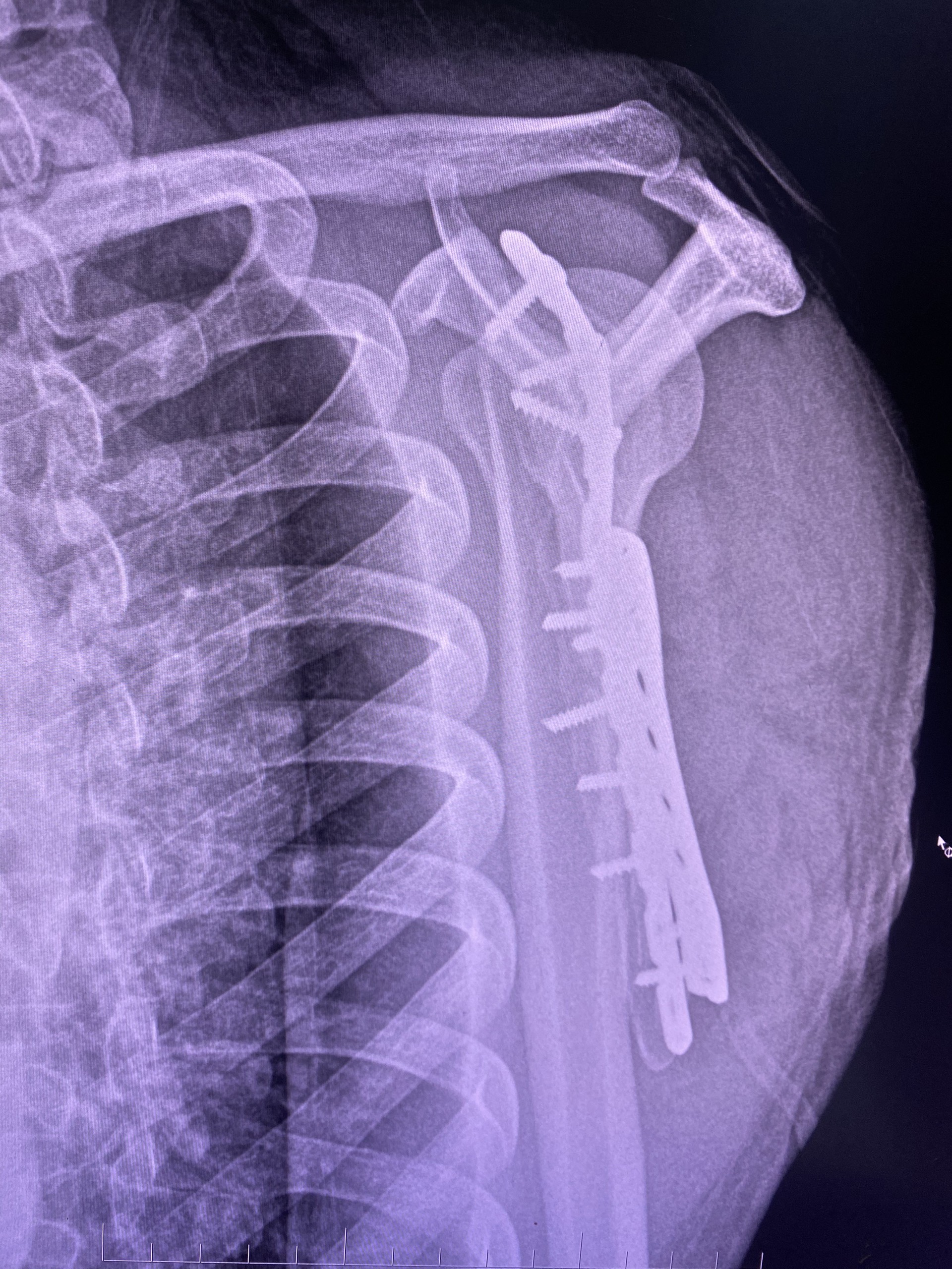 Sau một tuần điều trị, người bệnh tỉnh táo, huyết động ổn định, vùng vai nề nhẹ, đỡ đau nhức. Được chỉ định phẫu thuật kết hợp xương vai bằng nẹp vít. Người bệnh và người nhà đồng ý thực hiện phẫu thuật.