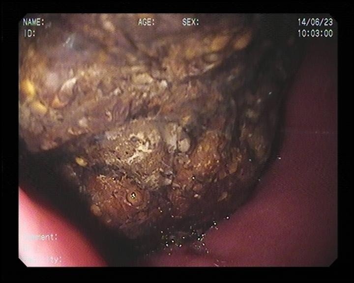 Ông Đ.V.N, 60 tuổi, ở nhà 3 ngày nay thấy chướng hơi đầy bụng, đau bụng âm ỉ vùng thượng vị và quanh rốn, buồn nôn và nôn nhiều, mệt mỏi, ăn kém. Người bệnh có tiền sử viêm loét dạ dày, suy thận và tăng huyết áp. Ông N. được người nhà đưa đến TTYT huyện Yên Lập để thăm khám. Sau thăm khám ban đầu, người bệnh được chỉ định nội soi thực quản, dạ dày, tá tràng bằng hệ thống nội soi tiêu hóa ống mềm tìm nguyên nhân đau bụng, buồn nôn, nôn nhiều. Qua hình ảnh nội soi, các bác sĩ phát hiện khối bã thức ăn lớn, kết tụ cứng, có kích thước khoảng 3 – 4cm trong dạ dày.